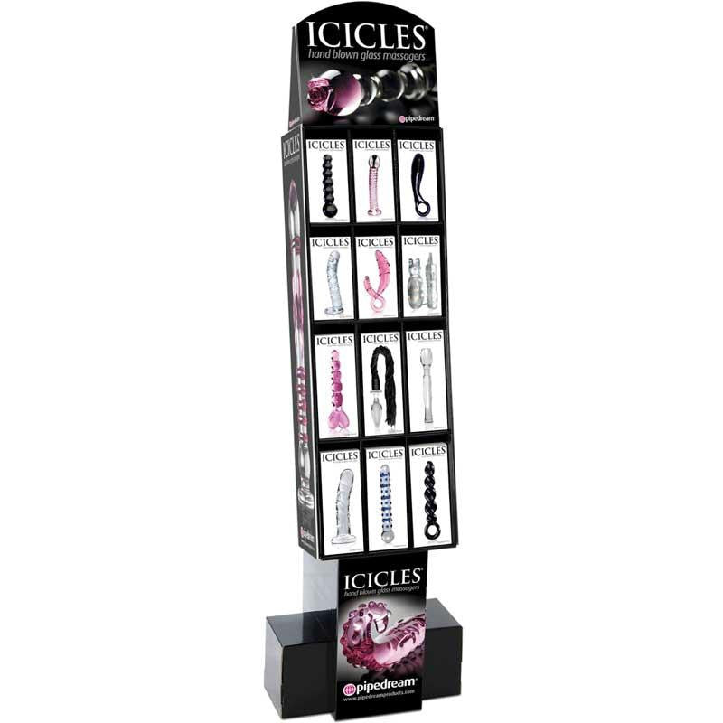 Icicles Display (36/DP)The 36-piece POP display comes pre-packed with 12 unique styles (3 boxes of each style), requiring only minor assembly for the base. The top two rows of the display hold the 8 inch boxes, while the bottom two rows hold the 10 inch boxes. The POP gives store owners an easy, space-saving way to display the Icicles range and makes a great addition to any retail store.Elegant, upscale, and hand-crafted with amazing attention to detail, this luxurious line of glass massagers will leave you breathless. Each hand-blown Icicle glass wand is sleek, unique, and made to play hard.The hypoallergenic glass is nonporous and body safe, and when cared for properly, is designed to last a lifetime. Run the wand under warm water or place it in the microwave to heat things up. Chill it under cold water or put it in the freezer for a cool sensation. Since glass is nonporous, cleanup is a snap. Use Toy Cleaner and warm water, or throw it in the dishwasher for a worry-free wash after the fun.Cardboard (Display).